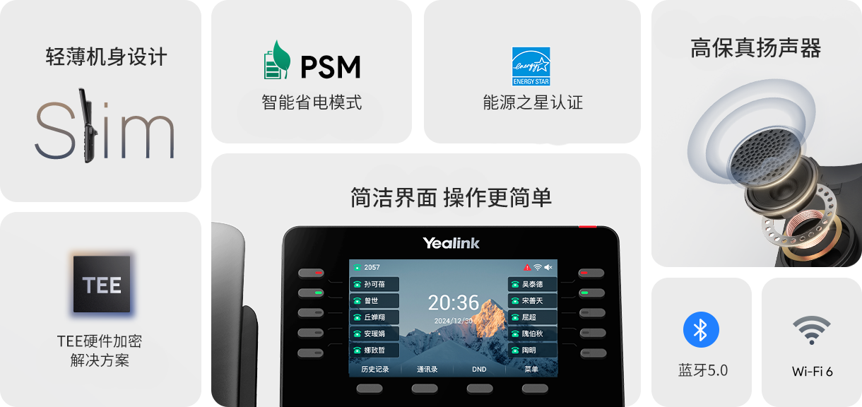 T8系列话机兼备人性化的操作界面,如 对方忙碌指示、针对特殊群体的无障碍阅读(大文本模式、高对比度模式、红绿色盲/色弱模式)等设置,便于快速阅读,办公沟通更高效、更便捷;界面简洁直观易操作,强大功能一触即发!
